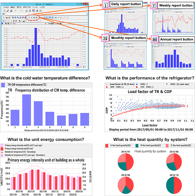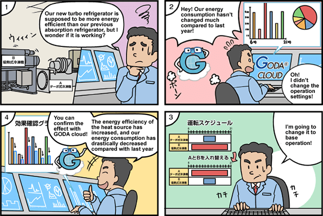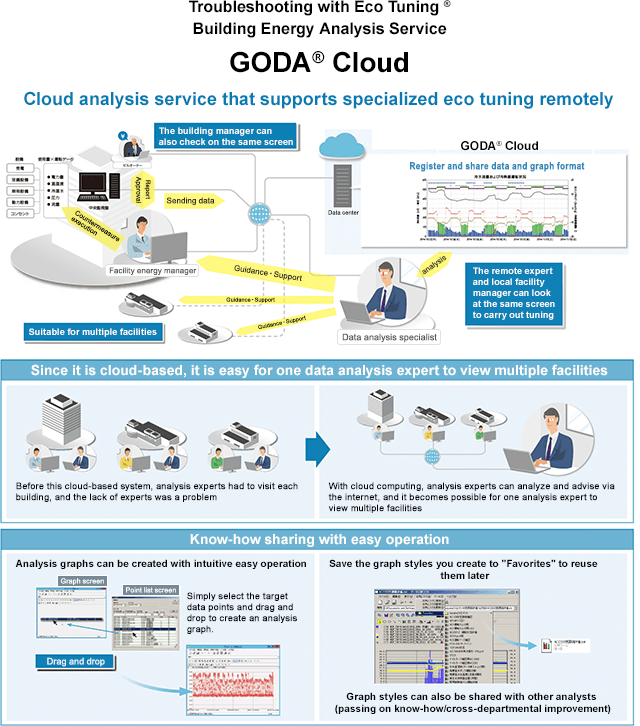 GODA® Cloud is a data collection and analysis tool that captures operation data in the central monitoring equipment of a building, analyzes operation from multiple angles in a short time, and realizes optimum energy-saving operation.