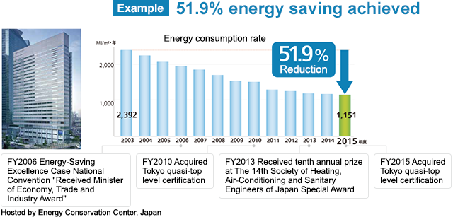 Panasonic Tokyo Shiodome Building has been using energy-saving tuning by fully utilizing this tool since 2003, and has achieved energy-saving of 51.9% (FY 2015) compared to the first year after completion of construction.